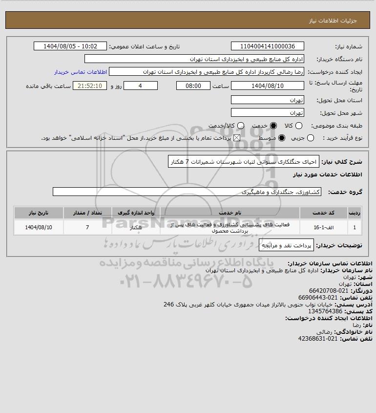 شرح کلی نیاز: احیای جنگلکاری سنواتی لتیان شهرستان شمیرانات 7 هکتار