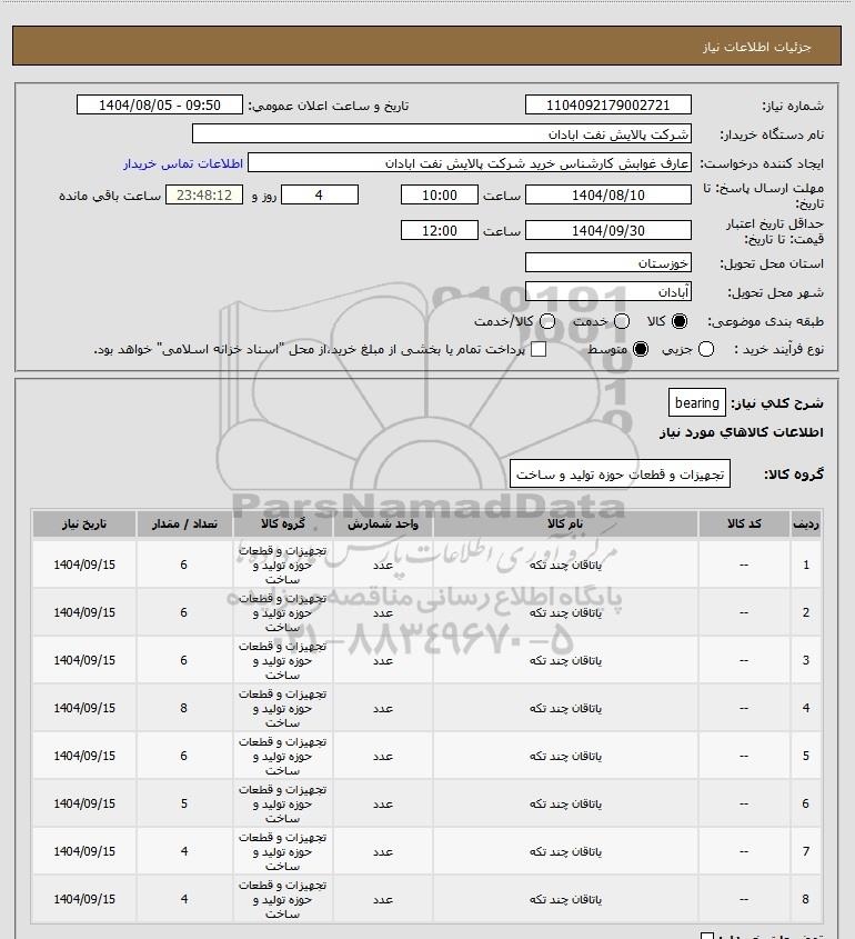 | 1 | -- | یاتاقان چند تکه | عدد | تجهیزات و قطعات حوزه تولید و ساخت | 6 | 1404/09/15 |
