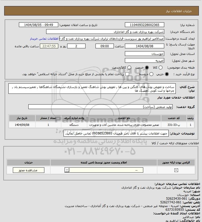 توضیحات خریدار: جهت اطلاعات بیشتر با اقای ناصر همیتان  09166523893 تماس حاصل نمائید.