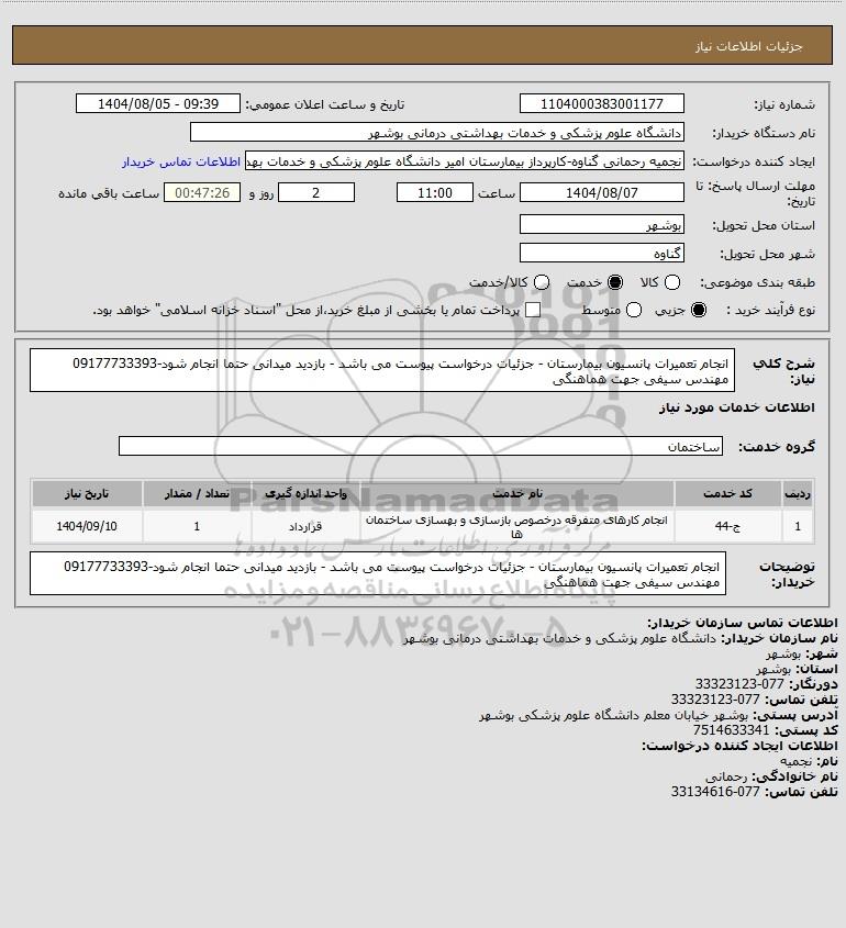 شرح کلی نیاز: انجام تعمیرات پانسیون بیمارستان - جزئیات درخواست پیوست می باشد - بازدید میدانی حتما انجام شود-09177733393 مهندس سیفی جهت هماهنگی