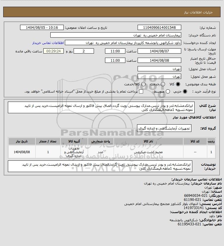 استعلام بها و موضوع استعلام استعلام ایرانکدمشابه.لدر و پودر تریس.مدارک پیوستی رویت گردد.الصاق پیش فاکتور و ارسال نمونه الزامیست.خرید پس از تایید نمونه.تسویه 1ماهه.قیمتگذاری کلی به اطلاع کلیه شرکت‌ها و افراد متخصص واجد شرایط می‌رساند، آگهی گذار در نظر دارد از طریق استعلام بها، نسبت به انتخاب و دریافت پیشنهادات اقدام نماید. این استعلام با کد آگهی ثبت شده در سامانه خبرگزاری پارس نماد : 9758838 منتشر شده است. مشخصات استعلام : تاریخ شروع استعلام: 1404/08/05 آخرین مهلت ارسال پیشنهاد قیمت : 1404/08/07 و محل اجرای پروژه : استان تهران میباشد. استعلام قیمت مورد درخواست : استعلام ایرانکدمشابه.لدر و پودر تریس.مدارک پیوستی رویت گردد.الصاق پیش فاکتور و ارسال نمونه الزامیست.خرید پس از تایید نمونه.تسویه 1ماهه.قیمتگذاری کلی با دسته‌بندی‌های تخصصی و گروه های مرتبط : خدمات و تجهیزات آزمایشگاهی و پزشکی, استعلام اطلاع رسانی میگردد.