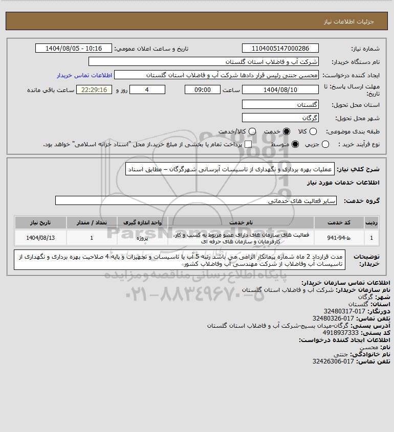 شرح کلی نیاز: عملیات بهره برداری و نگهداری از تاسیسات آبرسانی شهرگرگان – مطابق اسناد