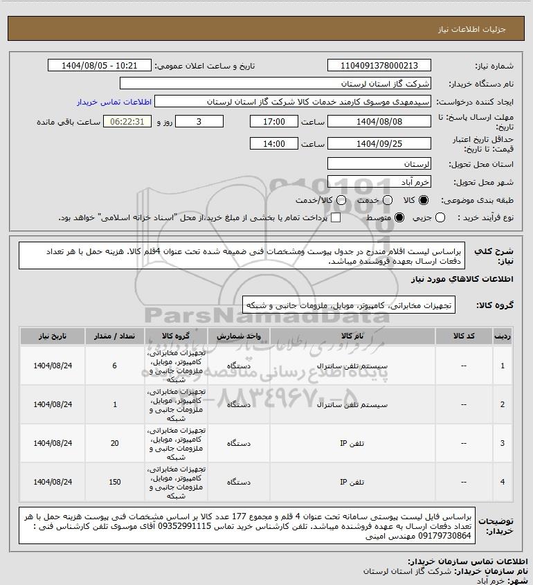 | 1 | -- | سیستم تلفن سانترال | دستگاه | تجهیزات مخابراتی، کامپیوتر، موبایل، ملزومات جانبی و شبکه | 6 | 1404/08/24 |