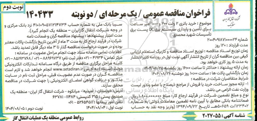 موضوع : خرید باتری 2 ولت 200 و 1000 آمپر ساعت برای تامین و پایداری سیستم برق DC پست برق تاسیسات شهید محمدی