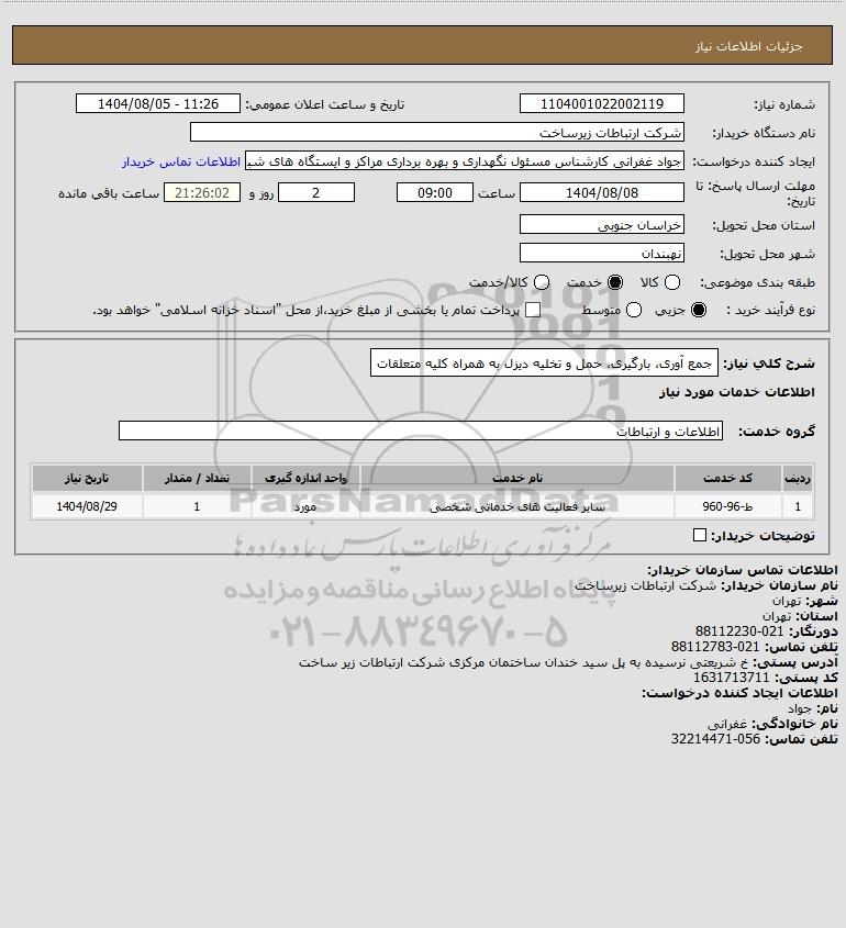 شرح کلی نیاز: جمع آوری، بارگیری، حمل و تخلیه دیزل به همراه کلیه متعلقات
