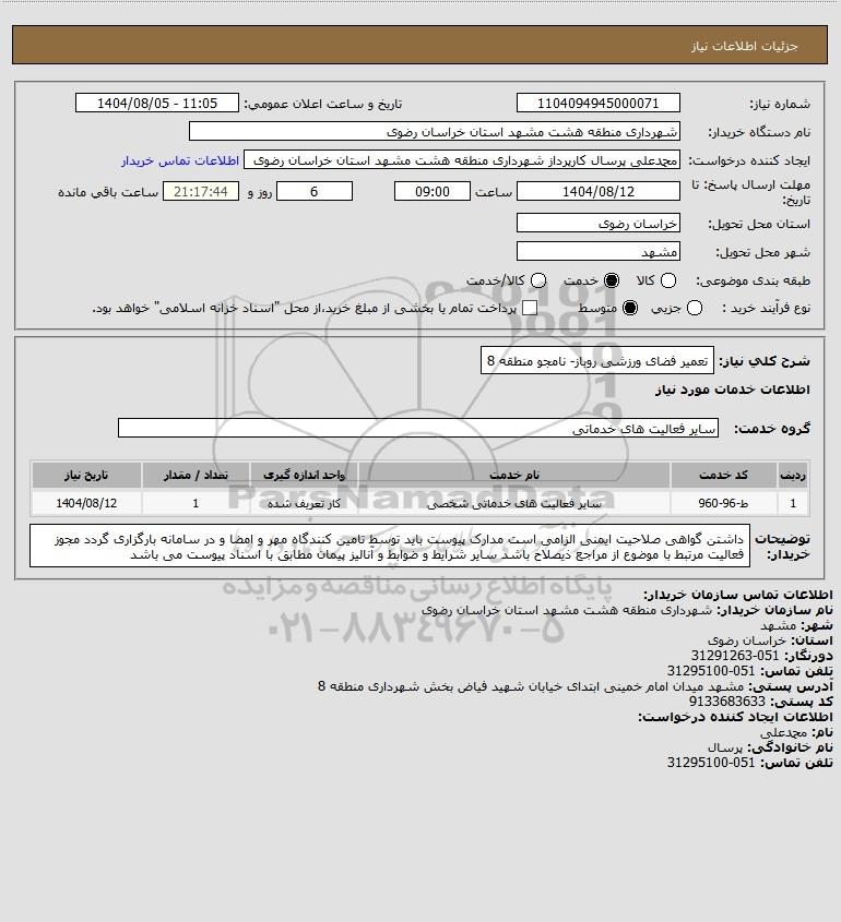 شرح کلی نیاز: تعمیر فضای ورزشی روباز- نامجو منطقه 8