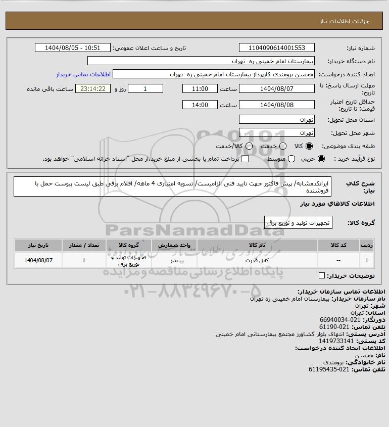 شرح کلی نیاز: ایرانکدمشابه/ پیش فاکتور جهت تایید فنی الزامیست/ تسویه اعتباری 4 ماهه/ اقلام برقی طبق لیست پیوست