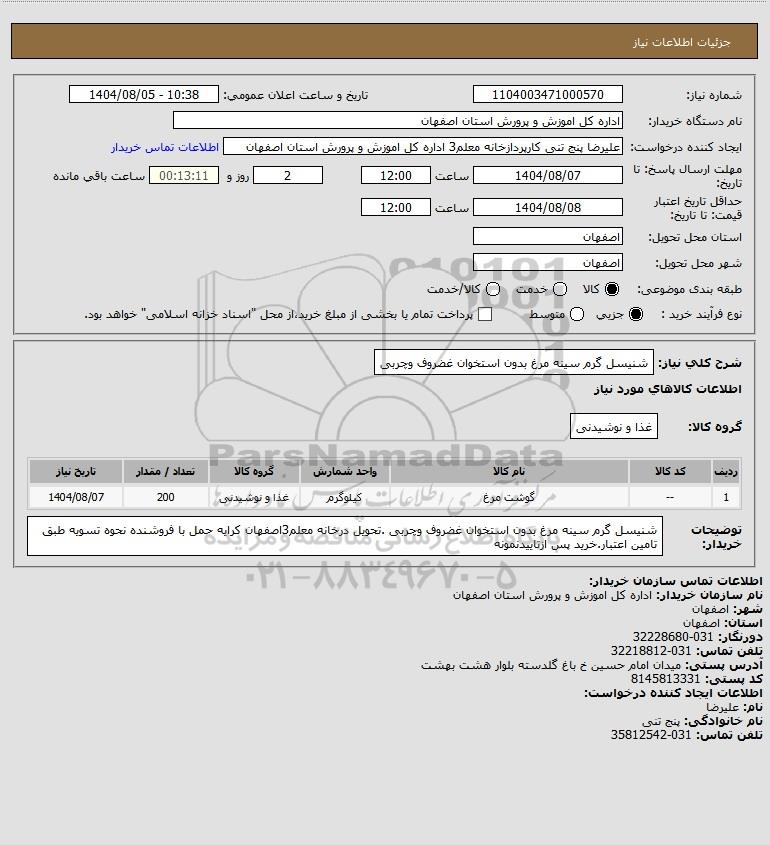 شرح کلی نیاز: شنیسل گرم سینه مرغ بدون استخوان غضروف وچربی