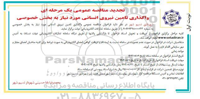 شهرداری نسیم شهر در نظر دارد فراخوان مناقصه عمومی واگذاری تامین نیروی انسانی مورد نیاز به بخش خصوصی به شماره 2004093980000033 را از طریق سامانه تدارکات الکترونیک دولت برگزار نماید.