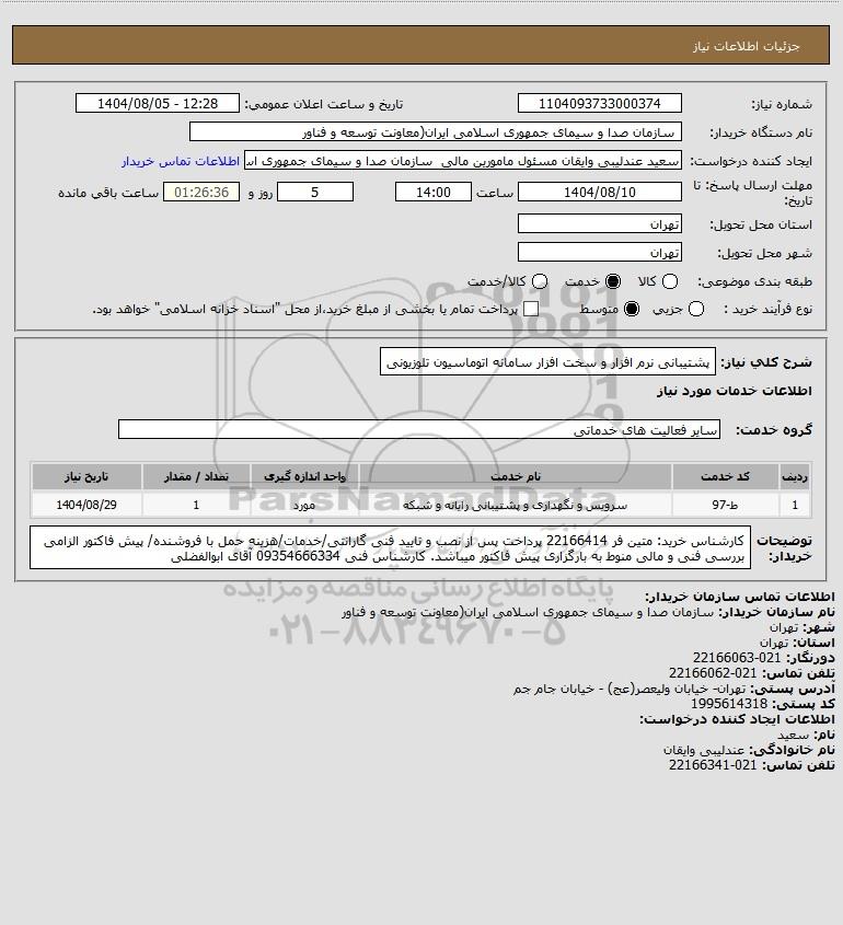 شرح کلی نیاز: پشتیبانی نرم افزار و سخت افزار سامانه اتوماسیون تلوزیونی
