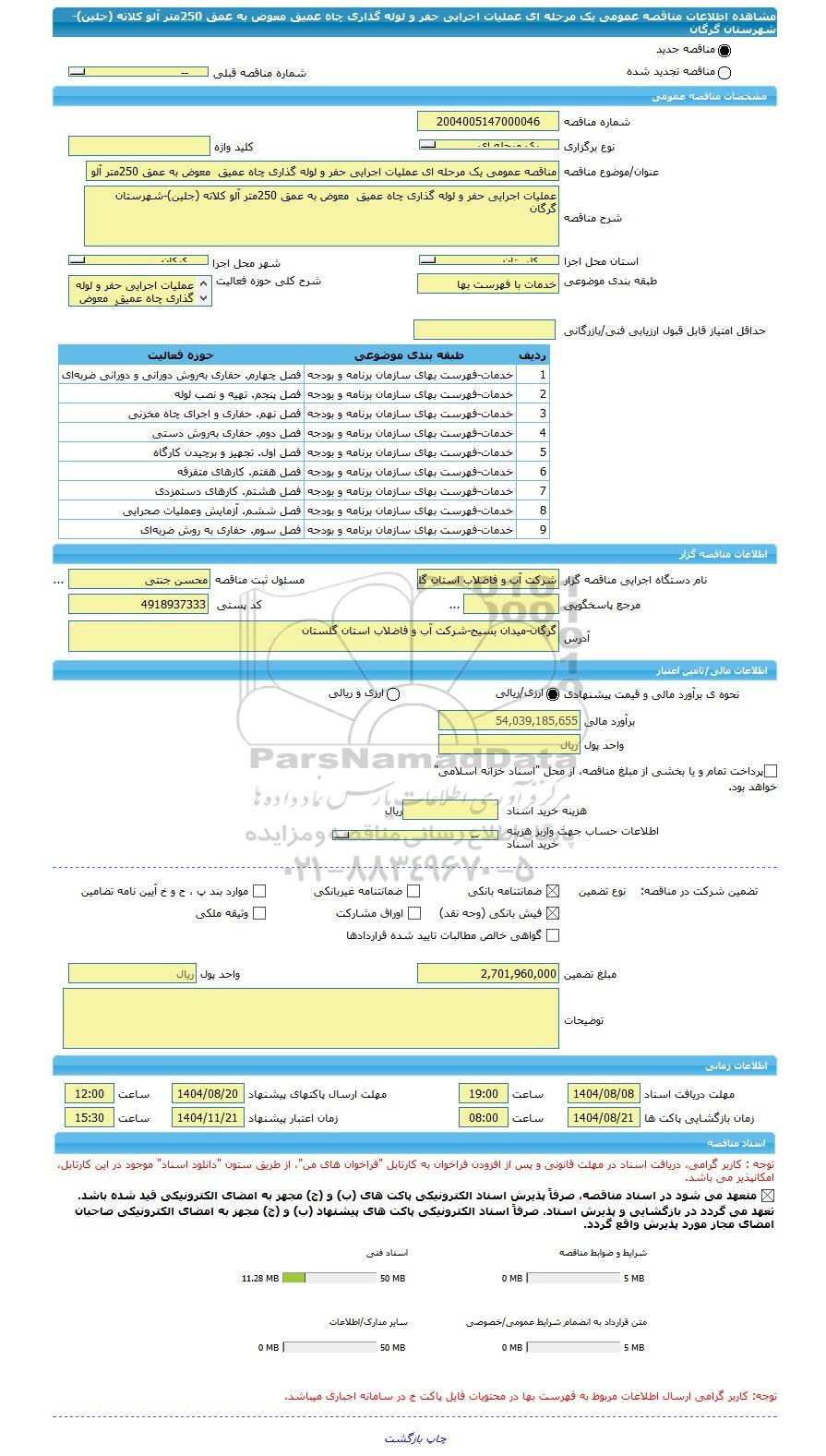 | شرح مناقصه | عملیات اجرایی حفر و لوله گذاری چاه عمیق معوض به عمق 250متر آلو کلاته (جلین)-شهرستان گرگان | ||||||||||||||||||||||||||||||||