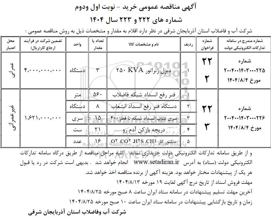222 | 1 | دیزل ژنراتور 250KVA | 3 | دستگاه | 4.000.000.000 | عمرانی |