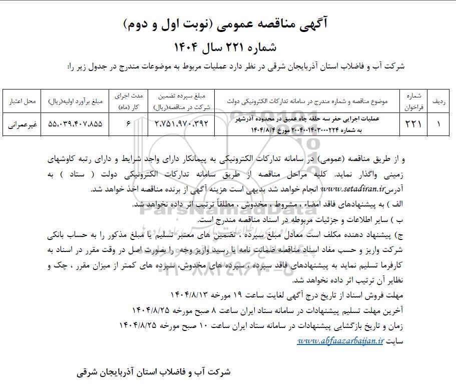 | 1 | 221 | عملیات اجرایی حفر سه حلقه چاه عمیق در محدوده آذرشهر به شماره 2004001403000224 مورخ 1404.8.4 | 2.751.970.392 | 6 | 55.039.407.855 | غیر عمرانی |