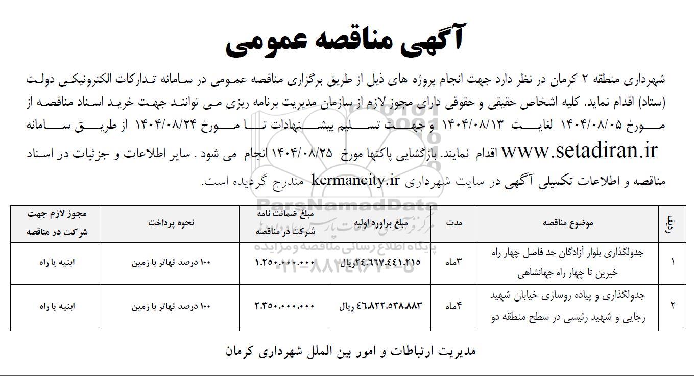 شهرداری منطقه دو کرمان در نظر دارد جهت انجام پروژه های ذیل از طریق برگزاری مناقصه عمومی در سامانه تدارکات الکترونیکی دولت (ستاد) اقدام نماید. کلیه اشخاص حقیقی و حقوقی دارای مجوز لازم از سازمان مدیریت برنامه ریزی می توانند جهت خرید اسناد مناقصه از مورخ 1404.8.5 لغایت 1404.8.13 و جهت تسلیم پیشنهادات تا مورخ 1404.8.24 از طریق سامانه ستاد ایران اقدام نمایند. بازگشایی پاکت ها مورخ 1404.8.25 انجام می شود. سایر اطلاعات و جزئیات در اسناد مناقصه و اطلاعات تکمیلی آگهی در سایت شهرداری kermancity.ir مندرج گردیده است.