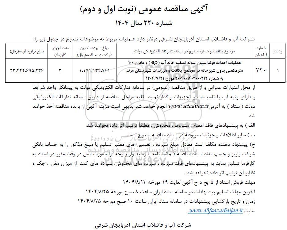 | 1 | 220 | عملیات احداث فونداسیون سوله تصفیه خانه آب (RO) و مخزن 100 مترمکعبی بدون شیرخانه در مجتمع یکانات و هرزندات شهرستان مرند به شماره 2004001403000212 مورخ 1404.7.21 | 1.171.134.761 | 3 | 23.422.695.236 |