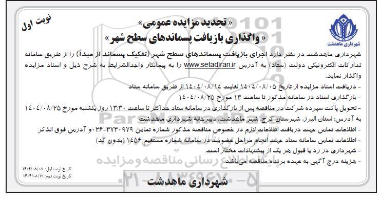 شهرداری ماهدشت در نظر دارد اجرای بازیافت پسماندهای سطح شهر (تفکیک پسماند از مبداء) را از طریق سامانه تدارکات الکترونیکی دولت ستاد به ادرس سایت ستاد ایران با واگذاری به پیمانکار واجدالشرایط به شرح ذیل اقدام نماید.