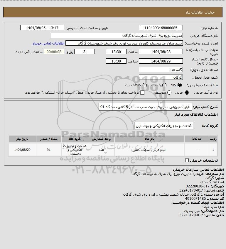 | 1 | -- | تابلو مرکز یا سوکت کنتور | عدد | قطعات و تجهیزات الکتریکی و روشنایی | 91 | 1404/08/29 |