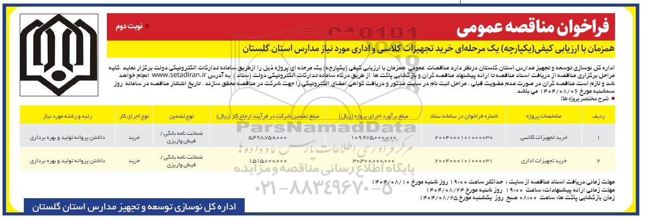 فراخوان مناقصه عمومی همزمان با ارزیابی کیفی (یکپارچه) یک مرحله ای خرید تجهیزات کلاسی و اداری مورد نیاز مدارس استان گلستان ؟