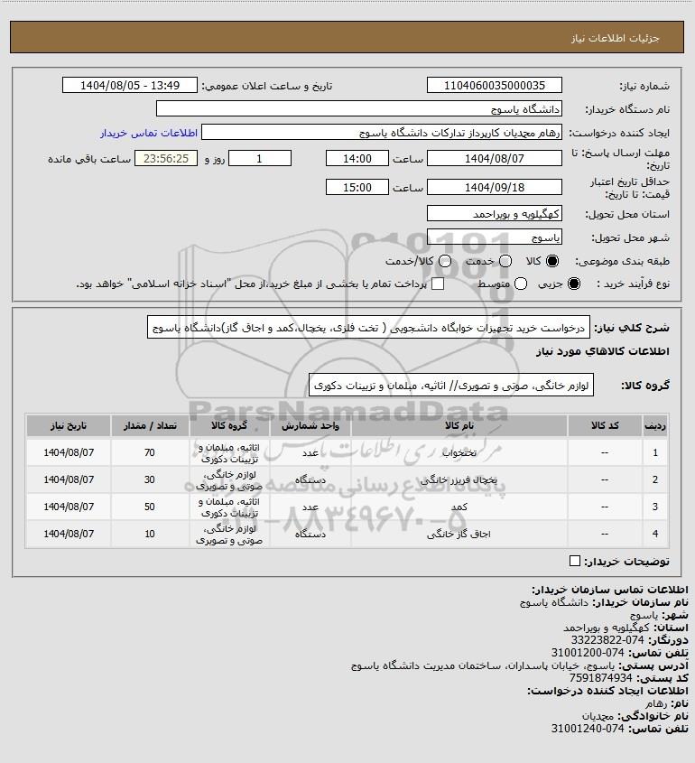شرح کلی نیاز: درخواست خرید تجهیزات خوابگاه دانشجویی ( تخت فلزی، یخچال،کمد و اجاق گاز)دانشگاه یاسوج