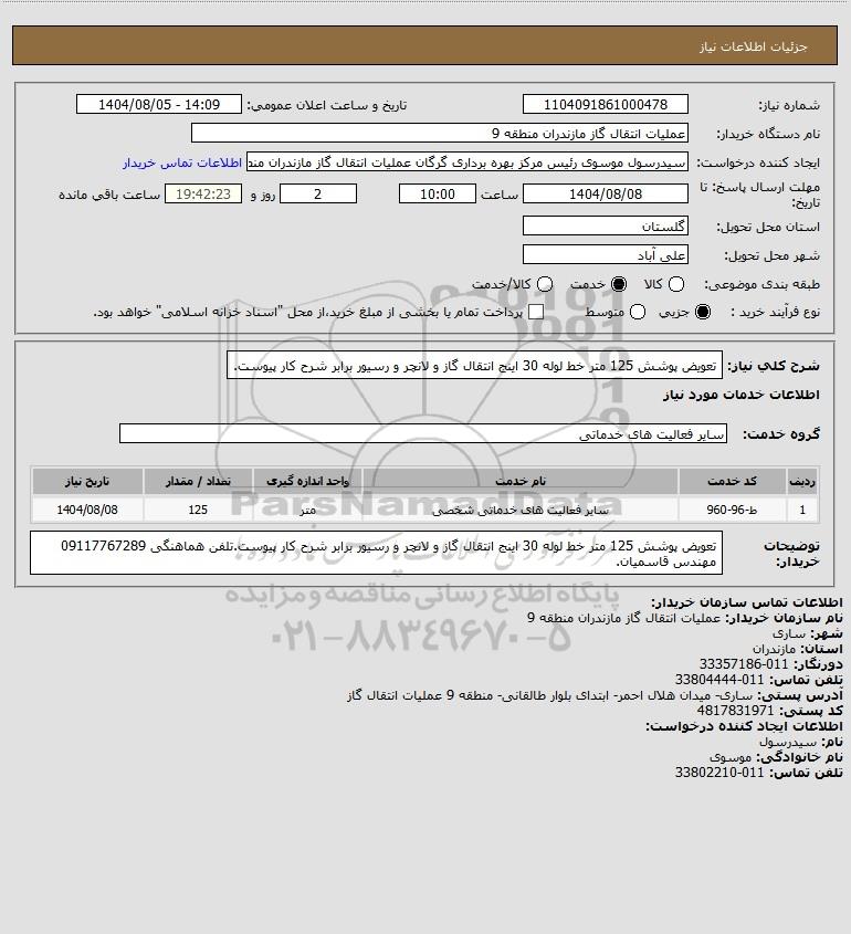 شرح کلی نیاز: تعویض پوشش 125 متر خط لوله 30 اینج انتقال گاز و لانچر و رسیور برابر شرح کار پیوست.