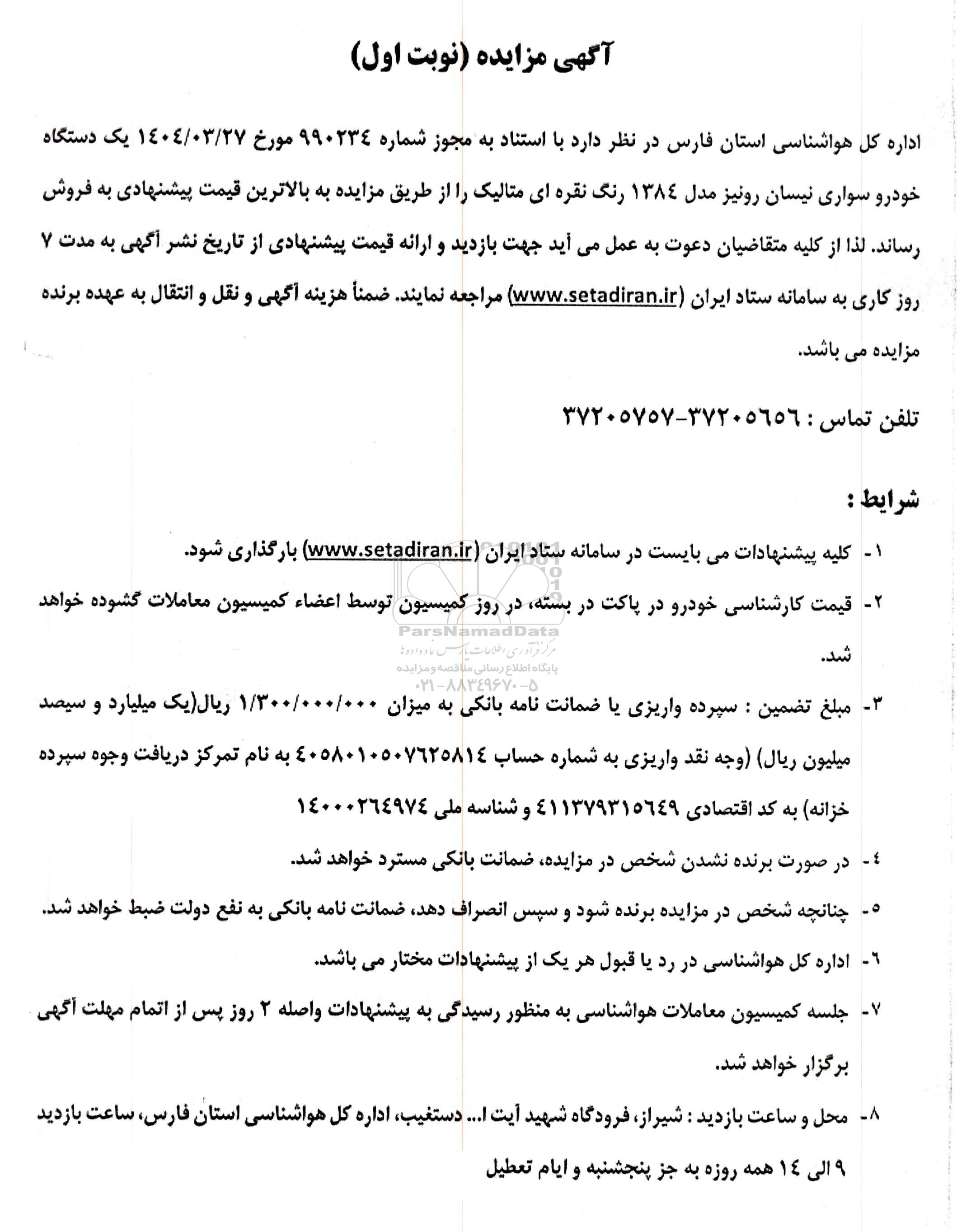 اداره کل هواشناسی استان فارس در نظر دارد با استناد به مجوز شماره 990234 مورخ 1404.3.27 یک دستگاه خودرو سواری نیسان رونیز مدل 1384 رنگ نقره ای متالیک را از طریق مزایده به بالاترین قیمت پیشنهادی به فروش رساند. لذا از کلیه متقاضیان دعوت به عمل می آید جهت بازدید و ارائه قیمت پیشنهادی از تاریخ نشر آگهی به مدت 7 روز کاری به سامانه ستاد ایران (سایت ستاد ایران) مراجعه نمایند. ضمناً هزینه آگهی و نقل و انتقال به عهده برنده