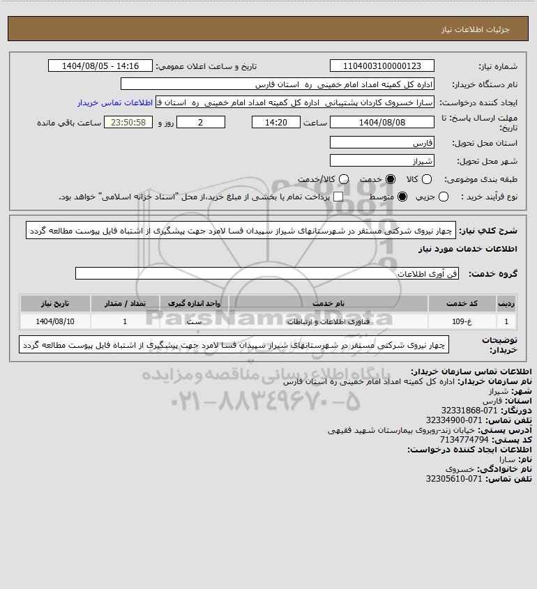 شرح کلی نیاز: چهار نیروی شرکتی مستقر در شهرستانهای شیراز سپیدان فسا لامرد جهت پیشگیری از اشتباه فایل پیوست مطالعه گردد