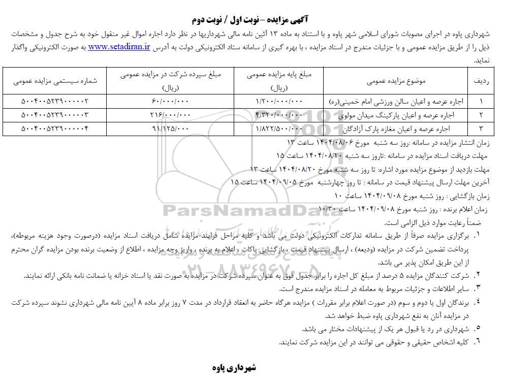 شهرداری پاوه در اجرای مصوبات شورای اسلامی شهر پاوه و با استناد به ماده 13 آئین نامه مالی شهرداریها در نظر دارد اجاره اموال غیر منقول خود به شرح جدول و مشخصات ذیل را از طریق مزایده عمومی و با جزئیات مندرج در اسناد مزایده ، با بهره گیری از سامانه ستاد الکترونیکی دولت به آدرس ستاد ایران به صورت الکترونیکی واگذار نماید.