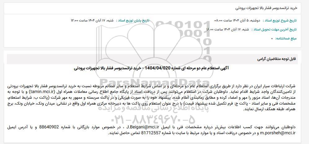 نحوه دریافت اسناد و ارسال پیشنهاد: متقاضیان می‌توانند با ثبت نام در سامانه مناقصات و مزایدات ایران (پارس نماد) نسبت به مشاهده اسناد استعلام، دریافت اطلاعات تکمیلی، و ثبت پیشنهاد قیمت خود اقدام نمایند. در صورت نیاز به دریافت راهنمایی یا پشتیبانی در خصوص استعلام و مناقصه و فراخوان مناقصه عمومی، مناقصه محدود، مناقصه بین‌ المللی، مناقصه دولتی، مناقصه خصوصی، مناقصه آنلاین فروش تجهیزات، مناقصه مشاوره‌ای مناقصه پتروشیمی و انرژی مناقصه صنایع و تجهیزات برق و مخابرات و نفت و گاز ... لطفاً با سایت خبری مناقصه و مزایده پارس‌نماد داده‌ها به شماره 88349670 تماس حاصل فرمایید.