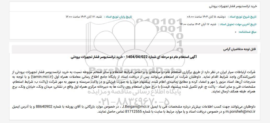شرکت ارتباطات سیار ایران در نظر دارد از طریق برگزاری استعلام عام دو مرحلهای و بر اساس شرایط استعلام و سایر ضمائم مربوطه نسبت به خرید ترانسدیوسر فشار تجهیزات برودتی از تامینکنندگان واجد شرایط اقدام نماید. داوطلبان شرکت در استعلام میتوانند پس از دریافت اسناد از پایگاه جامع اطلاع رسانی معاملات همراه اول (tamin.mci.ir) و با توجه به مندرجات آنها، اسناد مزبور را مهر و امضاء کرده و مطابق زمانبندی اعلام شده، پیشنهاد خود را به صورت فیزیکی و در پاکت سربسته و ممهور به مهر شرکت (پاکت ب: شرایط استعلام، مشخصات فنی و سایر اسناد - پاکت ج: فرم تکمیل شده پیشنهاد قیمت) با درج عنوان استعلام روی پاکت ها به دبیرخانه مرکزی همراه اول واقع در نشانی: میدان ونک، خیابان ونک، برج همراه، طبقه همکف ارسال نمایند.