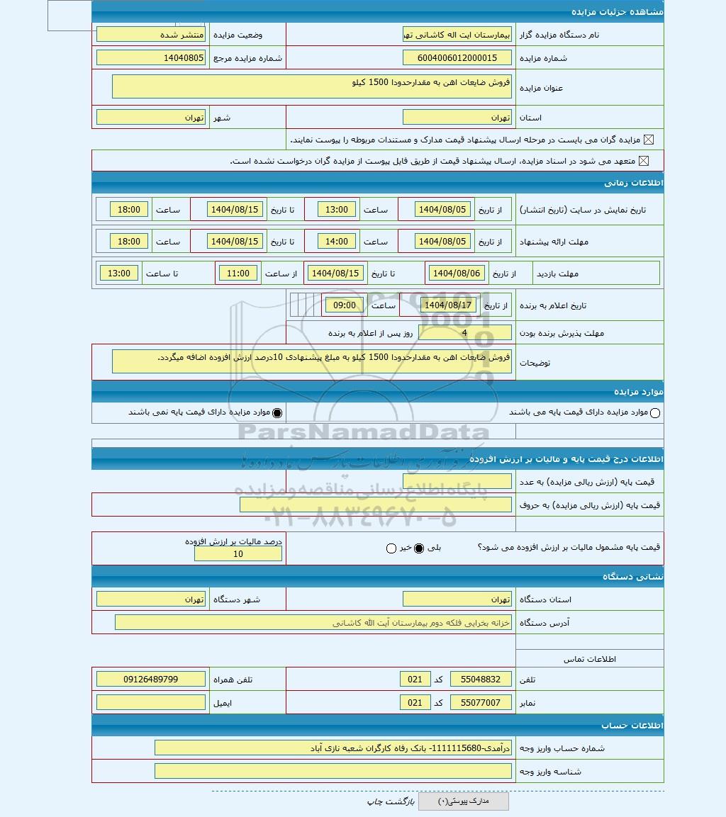 مزایده عمومی مزایده فروش ضایعات اهن به مقدارحدودا 1500 کیلو برگزار میگردد. از کلیه افراد متخصص و شرکتهای واجد شرایط دعوت به عمل میآید تا در این مزایده با کد خبرگزاری پارس نماد : 9760733 شرکت نمایند تاریخ شروع مزایده : 1404/08/05 مهلت شرکت در مزایده: تا پایان روز 1404/08/15 مکان برگزاری اموال واگذاری استانهای مزایدات استان تهران و دستهبندیهای مربوط به این حراجی آهن آلات میباشد.