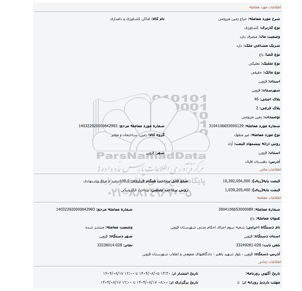 نام دستگاه اجرایی: شعبه سوم اجرای احکام مدنی شهرستان قزوین وضعیت معامله: منتشر شده