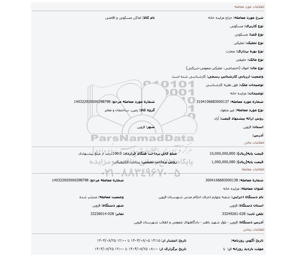 | نام دستگاه اجرایی: شعبه چهارم اجرای احکام مدنی شهرستان قزوین | وضعیت معامله: منتشر شده | |