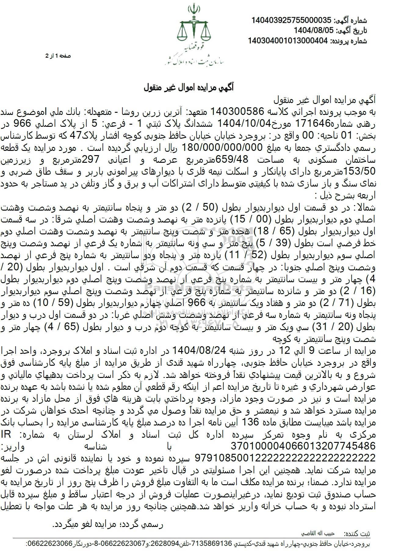 به موجب پرونده اجرائي كلاسه 140300586 متعهد آترین زرین روشا - متعهدله بانک ملی  موضوع سند رهنی شماره 171646 مورخ 1404.10.04 ششدانگ پلاک ثبتی 1 - فرعی 5 از پلاک اصلی 966 در بخش 01 ناحیه 00 واقع در بروجرد خیابان خیابان حافظ جنوبی کوچه افشار پلاک 47 که توسط کارشناس رسمی دادگستري جمعا به مبلغ 180.000.000.000 ریال ارزیابی گردیده است. مورد مزایده یک قطعه ساختمان مسکونی به مساحت 659.48 متر مربع عرصه و اعیانی 297 متر مربع و زیرزمین 153.50 متر مربع دارای پایانکار و اسکلت نیمه فلزی با دیوارهای پیرامونی باربر و سقف طاق ضربی و نمای سنگ و باز سازی شده با کیفیتی متوسط دارای اشتراکات آب و برق و گاز و تلفن در ید مستاجر به حدود اربعه بشرح ذيل :