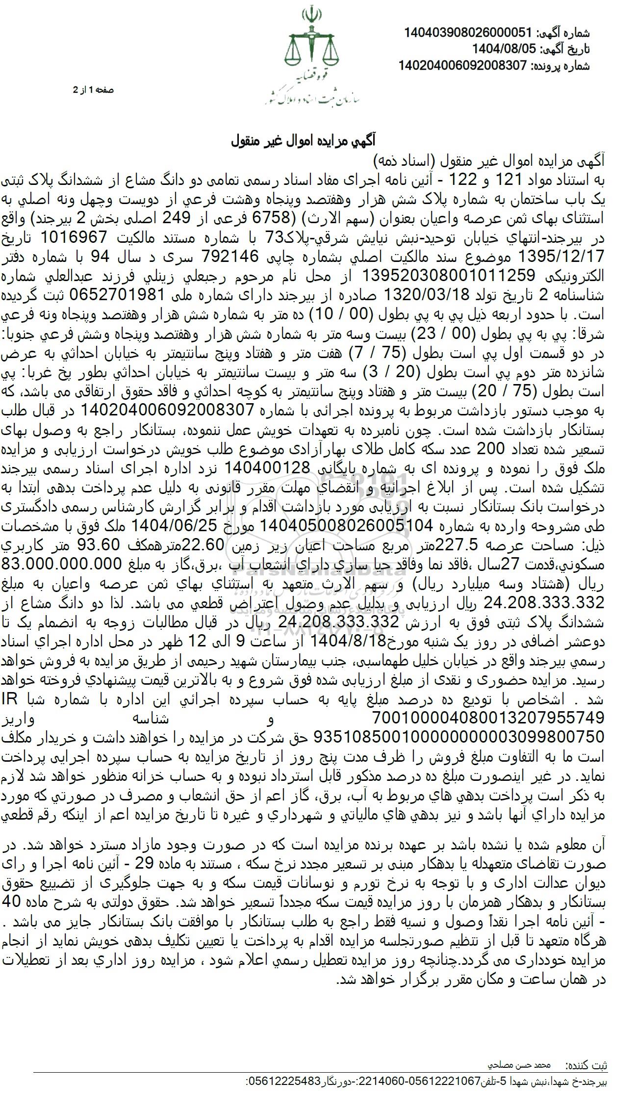 به استناد مواد 121 و 122 - آیین نامه اجرای مفاد اسناد رسمی تمامی دو دانگ مشاع از ششدانگ پلاک ثبتی یک باب ساختمان به شماره پلاک شش هزار و هفتصد و پنجاه و هشت فرعی از دویست و چهل و نه اصلي به استثنای بهای تمن عرصه و اعیان بعنوان سهم الارث (6758 فرعی از 249 اصلی بخش 2 بیرجند) واقع در بیرجند انتهای خیابان توحید نبش نیایش شرقی پلاک 73 با شماره مستند مالکیت 1016967 تاریخ 1395.12.17 موضوع سند مالكيت اصلي بشماره چاپی 792146 سری د سال 94 با شماره دفتر الکترونیکی 139520308001011259 از محل نام مرحوم رجبعلي زينلي فرزند عبدالعلی شماره شناسنامه 2 تاریخ تولد 1320.03.18 صادره از بیرجند دارای شماره ملی 0652701981 ثبت گردیده است. با حدود اربعه ذیل بي به پي بطول 00 . 10) ده متر به شماره شش هزار و هفتصد و پنجاه و نه فرعي شرقا پي به پی بطول 00 . (23) بیست و سه متر به شماره شش هزار و هفتصد و پنجاه و شش فرعي جنوبا در دو قسمت اول پی است بطول 75 . 7 هفت متر و هفتاد و پنج سانتیمتر به خیابان احداثی به عرض شانزده متر دوم بی است بطول (20) (20) . (3) سه متر و بیست سانتیمتر به خیابان احداثی بطور يخ غربا بي است بطول 20.75) بیست متر و هفتاد و پنج سانتیمتر به کوچه احداثی و فاقد حقوق ارتفاقی می باشد که به موجب دستور بازداشت مربوط به پرونده اجرائی با شماره 140204006092008307 در قبال طلب بستانکار بازداشت شده است. چون نامبرده به تعهدات خویش عمل ننموده بستانکار راجع به وصول بهای تسعیر شده تعداد 200 عدد سکه کامل طلای بهار آزادی موضوع طلب خویش درخواست ارزیابی و مزایده ملک فوق را نموده و پرونده ای به شماره بایگانی 140400128 نزد اداره اجرای اسناد رسمی بیرجند تشکیل شده است. پس از ابلاغ اجرائیه و انقضای مهلت مقرر قانونی به دلیل عدم پرداخت بدهی ابتدا به درخواست بانک بستانکار نسبت به ارزیابی مورد بازداشت اقدام و برابر گزارش کارشناس رسمی دادگستری طی مشروحه وارده به شماره 140405008026005104 مورخ 1404.06.25 ملک فوق با مشخصات ذیل مساحت عرصه 227.5 متر مربع مساحت اعیان زیر زمین 22.60 متر همکف 93.60 متر كاربري مسكوني، قدمت 27 سال ، فاقد نما وفاقد حيا ساري داراي انشعاب آب برق گار به مبلغ 83.000.000.000 ریال هشتاد و سه میلیارد ریال و سهم الارت متعهد به استثناي بهاي ثمن عرصه و اعیان به مبلغ 24.208.333.332 ریال ارزیابی و بدلیل عدم وصول اعتراض قطعی می باشد. لذا دو دانگ مشاع از ششدانگ پلاک ثبتی فوق به ارزش 24.208.333.332 ریال در قبال مطالبات زوجه به انضمام یک تا دو عشر اضافی در روز یک شنبه مورخ 1404.8.18 از ساعت 9 الی 12 ظهر در محل اداره اجرای استاد رسمی بیرجند واقع در خیابان خلیل طهماسبی جنب بیمارستان شهید رحیمی از طریق مزایده به فروش خواهد رسید. مزایده حضوری و نقدی از مبلغ ارزیابی شده فوق شروع و به بالاترین قیمت پیشنهادی فروخته خواهد شد شناسه واريز 935108500100000000003099800750 حق شرکت در مزایده را خواهند داشت و خریدار مکلف است ما به التفاوت مبلغ فروش را ظرف مدت پنج روز از تاریخ مزایده به حساب سپرده اجرایی پرداخت نماید. در غیر اینصورت مبلغ ده درصد مذکور قابل استرداد نبوده و به حساب خزانه منظور خواهد شد لازم به ذکر است پرداخت بدهي هاي مربوط به آب برق گاز اعم از حق انشعاب و مصرف در صورتی که مورد مزایده دارای آنها باشد و نیز بدهی های مالیاتی و شهرداری و غیره تا تاریخ مزایده اعم از اینکه رقم قطعی آن معلوم شده یا نشده باشد بر عهده برنده مزایده است که در صورت وجود مازاد مسترد خواهد شد. در صورت تقاضای متعهدله یا بدهکار مبنی بر تسعیر مجدد نرخ سکه ، مستند به ماده 29 - آئین نامه اجرا و رای دیوان عدالت اداری و با توجه به نرخ تورم و نوسانات قیمت سکه و به جهت جلوگیری از تضییع حقوق بستانکار و بدهکار همزمان با روز مزایده قیمت سکه مجدداً تسعیر خواهد شد حقوق دولتی به شرح ماده 40 - آئین نامه اجرا نقدا وصول و نسیه فقط راجع به طلب بستانکار با موافقت بانک بستانکار جایز می باشد . هرگاه متعهد تا قبل از تنظیم صورتجلسه مزایده اقدام به پرداخت یا تعیین تکلیف بدهی خویش نماید از انجام مزایده خودداری میگردد. چنانچه رو