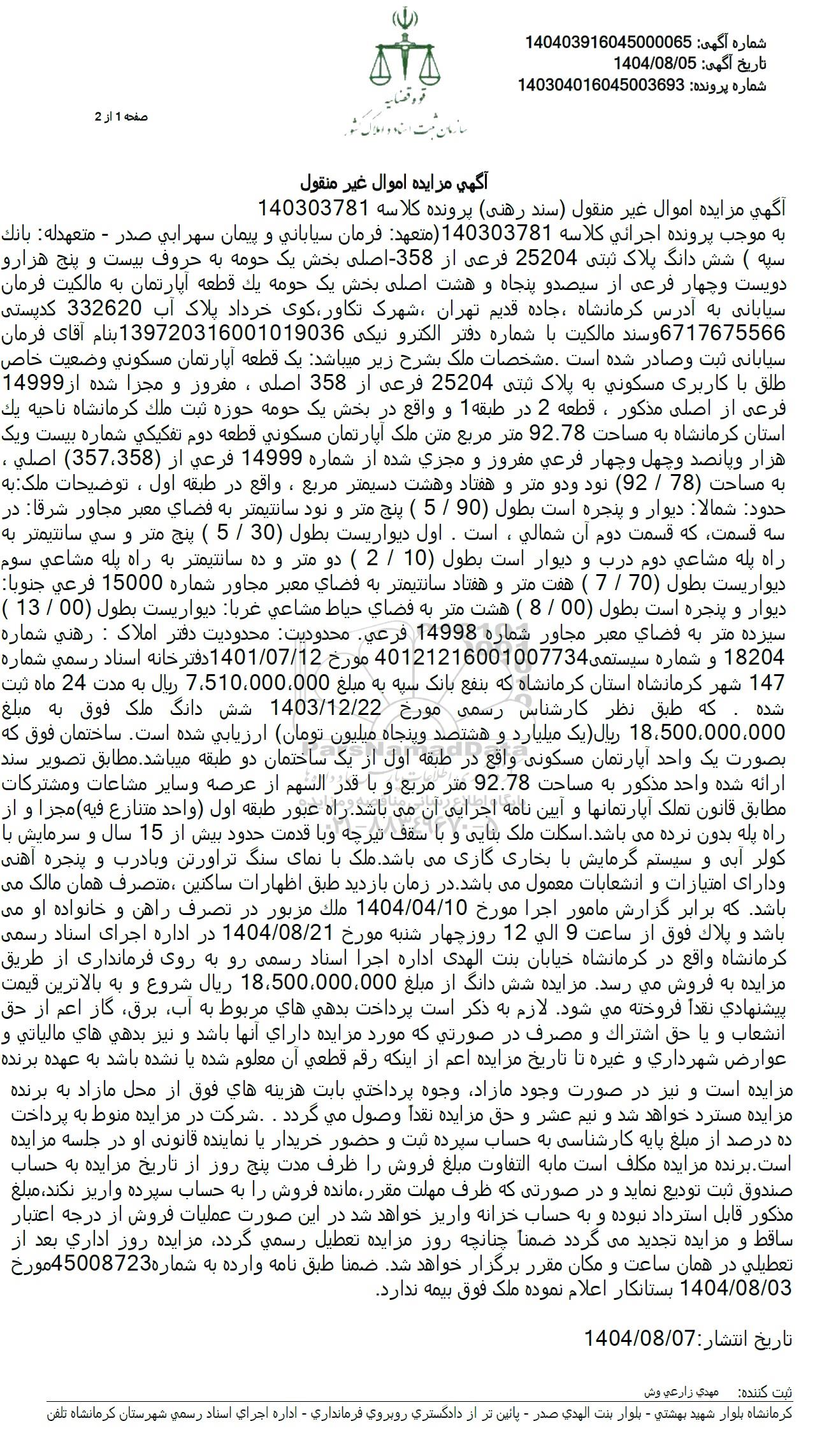 آگهی مزایده اموال غیر منقول سند رهنی پرونده کلاسه 140303781 به موجب پرونده اجرائی کلاسه 140303781 متعهد فرمان سیابانی و پیمان سهرابی صدر - متعهدله بانک سپه ( شش دانگ پلاک ثبتی 25204 فرعی از -358- اصلی بخش یک حومه به حروف بیست و پنج هزارو دویست و چهار فرعی از سیصد و پنجاه و هشت اصلی بخش یک حومه یک قطعه آپارتمان به مالکیت فرمان سیابانی به آدرس کرمانشاه جاده قدیم تهران شهرک، تکاور کوی خرداد پلاک آب 332620 کدپستی 6717675566 وسند مالکیت با شماره دفتر الکترو نیکی 139720316001019036 بنام آقای فرمان سیابانی ثبت و صادر شده است. مشخصات ملک بشرح زیر میباشد یک قطعه آپارتمان مسکونی وضعیت خاص طلق با کاربری مسکونی به پلاک ثبتی 25204 فرعی از 358 اصلی ، مفروز و مجرا شده از 14999 فرعی از اصلی مذکور ، قطعه 2 در طبقه 1 و واقع در بخش یک حومه حوزه ثبت ملک کرمانشاه ناحیه یک استان کرمانشاه به مساحت 92.78 متر مربع متن ملک آپارتمان مسکونی قطعه دوم تفکیکی شماره بیست و یک هزار و پانصد و چهل و چهار فرعی مفروز و مجری شده از شماره 14999 فرعی از (358 357) اصلی ، به مساحت (78 / 92 ) نود و دو متر و هفتاد و هشت دسیمتر مربع، واقع در طبقه اول ، توضیحات ملک به حدود شمالا دیوار و پنجره است بطول (90 / 5 ) پنج متر و نود سانتیمتر به فضای معبر مجاور شرقا در سه قسمت که قسمت دوم آن شمالی، است. اول دیواریست بطول (30 / 5 ) پنج متر و سی سانتیمتر به راه پله مشاعی دوم درب و دیوار است بطول (10 / 2 ) دو متر و ده سانتیمتر به راه پله مشاعی سوم دیواریست بطول (7/70) هفت متر و هفتاد سانتیمتر به فضای معبر مجاور شماره 15000 فرعی جنوبا: دیوار و پنجره است بطول (00 / 8 ) هشت متر به فضای حیاط مشاعی غربا دیوار بست بطول (00 / 13 ) سیزده متر به فضای معبر مجاور شماره 14998 فرعی محدودیت محدودیت دفتر املاک : رهنی شماره 18204 و شماره سیستمی 40121216001007734 مورخ 1401.07.12 دفتر خانه اسناد رسمی شماره شده 147 شهر کرمانشاه استان کرمانشاه که بنفع بانک سپه به مبلغ 7,510,000,000 ریال به مدت 24 ماه ثبت که طبق نظر کارشناس رسمی مورخ 1403.12.22 شش دانگ ملک فوق به مبلغ 18.500.000.000 ریال یک میلیارد و هشتصد و پنجاه میلیون تومان ارزیابی شده است. ساختمان فوق که بصورت یک واحد آپارتمان مسکونی واقع در طبقه اول از یک ساختمان دو طبقه میباشد. مطابق تصویر سند ارائه شده واحد مذکور به مساحت 92.78 متر مربع و با قدر السهم از عرصه و سایر مشاعات ومشترکات مطابق قانون تملک آپارتمانها و آیین نامه اجرایی آن می باشد. راه عبور طبقه اول واحد متنازع فیه مجزا و از راه پله بدون نرده می باشد. اسکلت ملک بنایی و با سقف تیرچه و با قدمت حدود بیش از 15 سال و سرمایش با کولر آبی و سیستم گرمایش با بخاری گازی می باشد. ملک با نمای سنگ تراورتن و با درب و پنجره آهنی و دارای امتیازات و انشعابات معمول می باشد. در زمان بازدید طبق اظهارات ساکتین ، متصرف همان مالک می باشد. که برابر گزارش مامور اجرا مورخ 1404.04.10 ملک مزبور در تصرف راهن و خانواده او می باشد و پلاک فوق از ساعت 9 الی 12 روز چهار شنبه مورخ 1404.08.21 در اداره اجرای اسناد رسمی کرمانشاه واقع در کرمانشاه خیابان بنت الهدی اداره اجرا اسناد رسمی رو به روی فرمانداری از طریق مزایده به فروش می رسد. مزایده شش دانگ از مبلغ 18.500.000.000 ریال شروع و به بالاترین قیمت پیشنهادی نقدا فروخته میشود. لازم به ذکر است پرداخت بدهی های مربوط به آب برق گاز اعم از حق انشعاب و یا حق اشتراک و مصرف در صورتی که مورد مزایده دارای آنها باشد و نیز بدهی های مالیاتی و عوارض شهرداری و غیره تا تاریخ مزایده اعم از اینکه رقم قطعی آن معلوم شده یا نشده باشد به عهده برنده مزایده است و نیز در صورت وجود مازاد وجوه پرداختی بابت هزینه های فوق از محل مازاد به برنده مزایده مسترد خواهد شد و نیم عشر و حق مزایده نقدا وصول می گردد. شرکت در مزایده منوط به پرداخت ده درصد از مبلغ پایه کارشناسی به حساب سپرده ثبت و حضور خریدار با نماینده قانونی او در جلسه مزایده است. برنده مزایده مکلف است ما به التفاوت مبلغ فروش را ظرف مدت پنج روز از تاریخ مزایده به حس