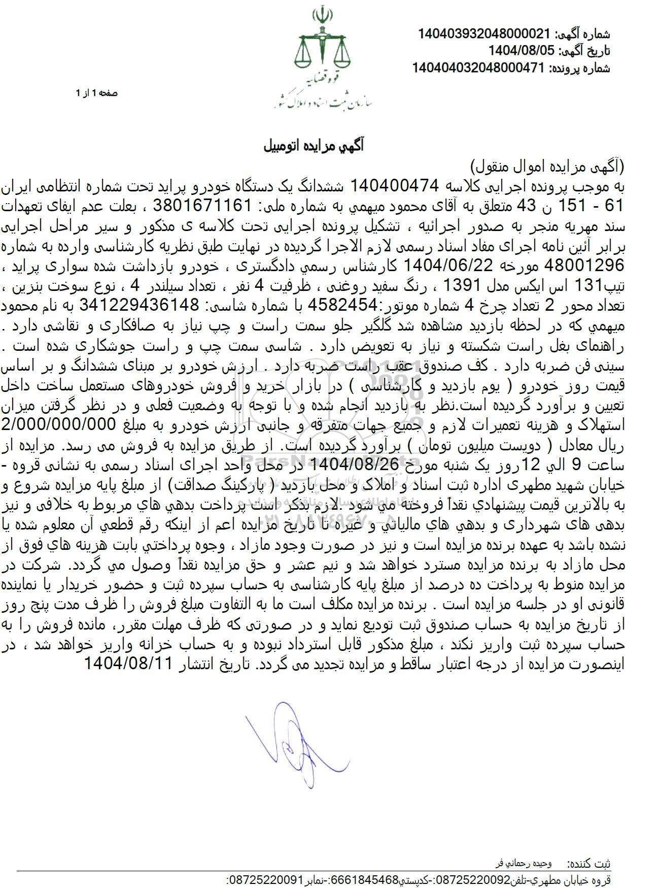به موجب پرونده اجرایی کلاسه 140400474 ششدانگ یک دستگاه خودرو پراید تحت شماره انتظامی ایران 61 - 151 ن 43 متعلق به آقای محمود میهمي به شماره ملی 3801671161 ، بعلت عدم ایفای تعهدات سند مهریه منجر به صدور اجرائیه ، تشکیل پرونده اجرایی تحت کلاسه ی مذکور و سیر مراحل اجرایی برابر آئین نامه اجرای مفاد اسناد رسمی لازم الاجرا گردیده در نهایت طبق نظریه کارشناسی وارده به شماره 48001296 مورخه 1404.06.22 کارشناس رسمی دادگستری، خودرو بازداشت شده سواری پراید ، تیپ 131 اس ایکس مدل 1391 ، رنگ سفید روغنی ، ظرفیت 4 نفر ، تعداد سیلندر 4 ، نوع سوخت بنزین ، تعداد محور 2 تعداد چرخ 4 شماره موتور : 4582454 با شماره شاسی 341229436148 به نام محمود ميهمي که در لحظه بازدید مشاهده شد گلگیر جلو سمت راست و چپ نیاز به صافکاری و نقاشی دارد . راهنمای بغل راست شکسته و نیاز به تعویض دارد. شاسی سمت چپ و راست جوشکاری شده است . سینی فن ضربه دارد . کف صندوق عقب راست ضربه دارد. ارزش خودرو بر مبنای ششدانگ و بر اساس قیمت روز خودرو ) یوم بازدید و کارشناسی ( در بازار خرید و فروش خودروهای مستعمل ساخت داخل تعیین و برآورد گردیده است. نظر به بازدید انجام شده و با توجه به وضعیت فعلی و در نظر گرفتن میزان استهلاک و هزینه تعمیرات لازم و جميع جهات متفرقه و جانبی ارزش خودرو به مبلغ 2.000.000.000 ریال معادل ( دویست میلیون تومان ( برآورد گردیده است از طریق مزایده به فروش می رسد. مزایده از ساعت 9 الی 12 روز یک شنبه مورخ 1404.08.26 در محل واحد اجرای اسناد رسمی به نشانی قروه -خیابان شهید مطهری اداره ثبت اسناد و املاک و محل بازدید ) پارکینگ صداقت از مبلغ پایه مزایده شروع و به بالاترین قیمت پیشنهادی نقدا فروخته ميشود لازم بذکر است پرداخت بدهي هاي مربوط به خلافی و نیز بدهی های شهرداری و بدهي هاي مالياتي و غیره تا تاریخ مزایده اعم از اینکه رقم قطعی آن معلوم شده یا نشده باشد به عهده برنده مزایده است و نیز در صورت وجود مازاد ، وجوه پرداختی بابت هزینه های فوق از محل مازاد به برنده مزایده مسترد خواهد شد و نیم عشر و حق مزایده نقداً وصول می گردد. شرکت در مزایده منوط به پرداخت ده درصد از مبلغ پایه کارشناسی به حساب سپرده ثبت و حضور خریدار یا نماینده قانونی او در جلسه مزایده است. برنده مزایده مکلف است ما به التفاوت مبلغ فروش را ظرف مدت پنج روز از تاریخ مزایده به حساب صندوق ثبت تودیع نماید و در صورتی که ظرف مهلت مقرر مانده فروش را به حساب سپرده ثبت واریز نکند، مبلغ مذکور قابل استرداد نبوده و به حساب خزانه واریز خواهد شد ، در