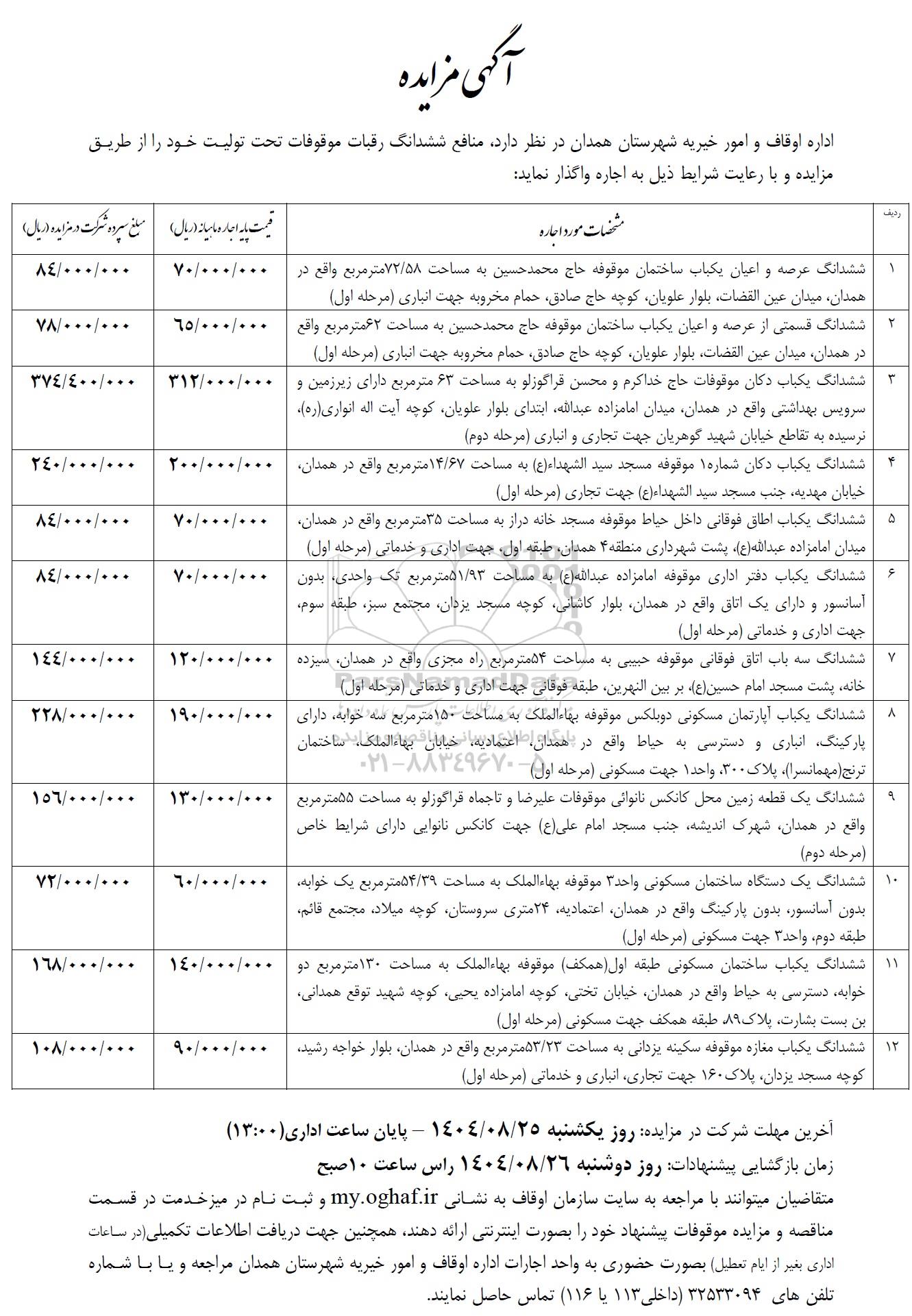 اداره اوقاف و امور خیریه شهرستان همدان در نظر دارد منافع ششدانگ رقبات موقوفات تحت تولیت خود را از طریق مزایده و با رعایت شرایط ذیل به اجاره واگذار نماید.