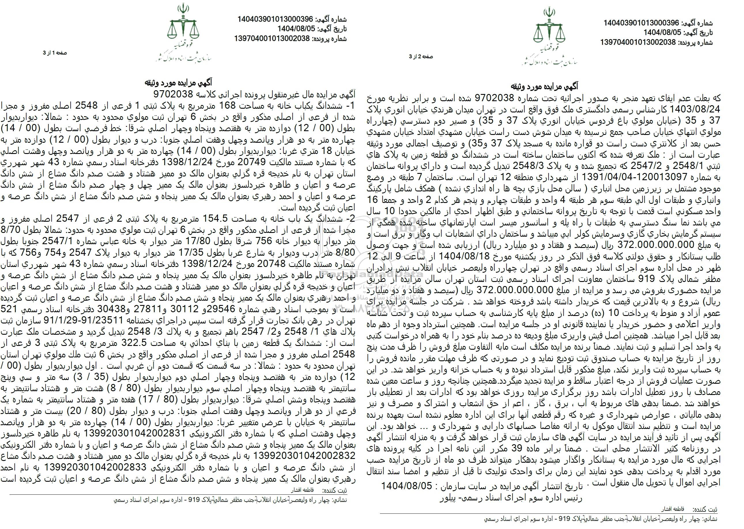 مزایده ششدانگ یکباب خانه به مساحت 168 مترمربع به پلاک ثبتی 1 فرعی از 2548 اصلی
