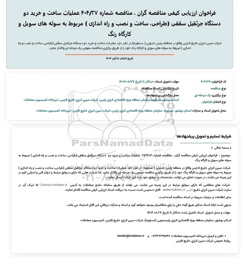 موضوع : فراخوان ارزیابی کیفی مناقصه گران، مناقصه شماره 27.404 عملیات ساخت و خرید دو دستگاه جرثقیل سقفی (طراحی ساخت و نصب و راه اندازی) مربوط به سوله های سویل و کارگاه رنگ