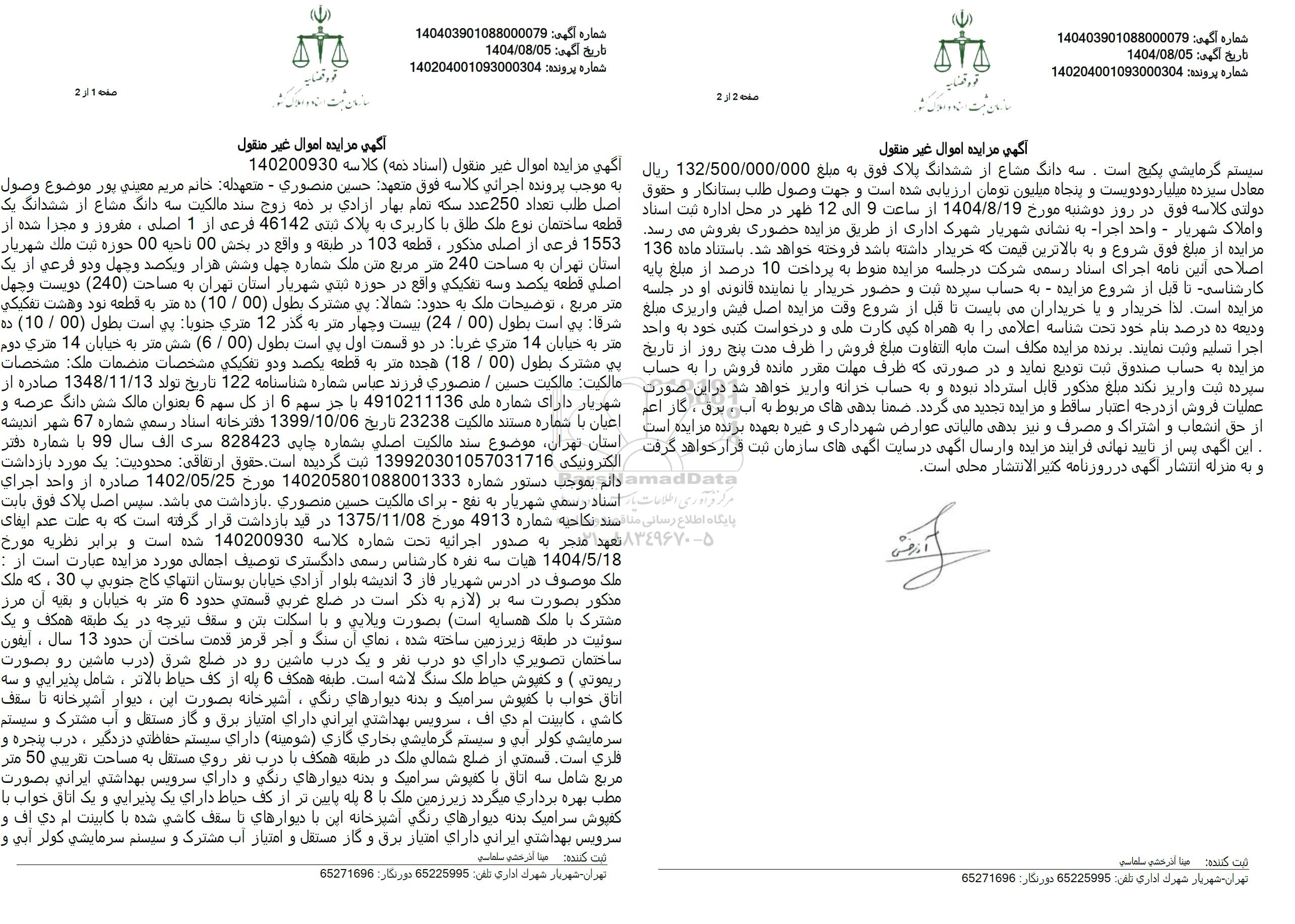 آگهی مزایده اموال غیر منقول اسناد ذمه کلاسه 140200930 به موجب پرونده اجرانی کلاسه فوق متعهد حسین منصوری - متعهدله خانم مریم معینی یور موضوع وصول اصل طلب تعداد 250 عدد سکه تمام بهار آزادی بر ذمه زوج سند مالکیت سه دانگ مشاع از ششدانگ یک قطعه ساختمان نوع ملک طلق با کاربری به پلاک ثبتی 46142 فرعی از 1 اصلی ، مغرور و مجرا شده از 1553 فرعی از اصلی مذکور، قطعه 103 در طبقه و واقع در بخش 00 ناحیه 00 حوزه ثبت ملك شهریار استان تهران به مساحت 240 متر مربع متن ملک شماره چهل و شش هزار و یکصد و چهل و دو فرعی از یک اصلی قطعه یكصد و سه تفکیکی واقع در حوزه ثبتی شهریار استان تهران به مساحت (240) دویست و چهل متر مربع ، توضیحات ملک به حدود شمالا بی مشترک بطول (00 . 10) ده متر به قطعه نود و هشت تفکیکی شرقا پی است بطول 00 . 24 بیست و چهار متر به گذر 12 متری جنوبا پی است بطول (00 . 10) ده متر به خیابان 14 متری غربا در دو قسمت اول پی است بطول (00 . (6) شش متر به خیابان 14 متری دوم بی مشترك بطول (00 . (18) هجده متر به قطعه یکصد ودو تفكیكی مشخصات منضمات ملک: مشخصات مالکیت مالکیت حسین . منصوری فرزند عباس شماره شناسنامه 122 تاریخ تولد 1348.11.13 صادره از شهربار دارای شماره ملی 4910211136 با جز سهم 6 از کل سهم 6 بعنوان مالک شش دانگ عرصه و اعیان با شماره مستند مالکیت 23238 تاریخ 1399.10.06 دفترخانه استاد رسمی شماره 67 شهر اندیشه استان تهران موضوع سند مالکیت اصلی بشماره چایی 828423 سری الف سال 99 با شماره دفتر الكترونیكی 139920301057031716 ثبت گردیده است. حقوق ارتفاقی محدودیت یک مورد بازداشت دانم بموجب دستور شماره 140205801088001333 مورخ 1402.05.25 صادره از واحد اجرای اسناد رسمی شهریار به نفع - برای مالکیت حسین منصوری بازداشت می باشد. سپس اصل پلاک فوق بابت سند نکاحیه شماره 4913 مورخ 1375.11.08 در قید بازداشت قرار گرفته است که به علت عدم ایفای تعهد منجر به صدور اجرائیه تحت شماره کلاسه 140200930 شده است و برابر نظریه مورخ 1404.5.18 هیات سه نفره کارشناس رسمی دادگستری توصیف اجمالی مورد مزایده عبارت است از : ملک موصوف در ادرس شهریار فاز 3 اندیشه بلوار آزادی خیابان بوستان انتهای کاج جنوبی ب 30 ، که ملک مذکور بصورت سه بر لازم به ذکر است در ضلع غربی قسمتی حدود 6 متر به خیابان و بقیه آن مرز مشترک با ملک همسایه است بصورت ویلایی و با اسکلت بتن و سقف تیرچه در یک طبقه همکف و یک سوئیت در طبقه زیرزمین ساخته شده، نمای آن سنگ و آجر قرمز قدمت ساخت آن حدود 13 سال ، أیفون ساختمان تصویری دارای دو درب نفر و یک درب ماشین رو در ضلع شرق درب ماشین رو بصورت ریموتی و کفپوش حیاط ملک سنگ لاشه است. طبقه همکف 6 پله از کف حیاط بالاتر، شامل پذیرایی و سه اتاق خواب با کفپوش سرامیک و بدنه دیوارهای رنگی اشپرخانه بصورت این دیوار اشپرخانه تا سقف كاشی ، كابینت ام دی اف ، سرویس بهداشتی ایرانی دارای امتیاز برق و گار مستقل و آب مشترک و سیستم سرمایشی کولر آبی و سیستم گرمایشی بخاری گازی (شومینه) دارای سیستم حفاظتی دزدگیر ، درب پنجره و فری است. قسمتی از ضلع شمالی ملک در طبقه همکف با درب نفر روی مستقل به مساحت تقریبی 50 متر مربع شامل سه اتاق با کفپوش سرامیک و بدنه دیوارهای رنگی و دارای سرویس بهداشتی ایرانی بصورت مطب بهره برداری میگردد زیر زمین ملک با 8 پله پایین تر از کف حیاط دارای یک پذیرایی و یک اتاق خواب با کفپوش سرامیک بدنه دیوارهای رنگی اشپرخانه این با دیوارهای تا سقف کاشی شده با کابینت ام دی اف و سرویس بهداشتی ایرانی دارای امتیاز برق و گار مستقل و امتیاز آب مشترک و سیستم سرمایشی کولر آبی و  سیستم گرمایشی پکیج است. سه دانگ مشاع از ششدانگ پلاک فوق به مبلغ 132.500.000.000 ریال معادل سپرده میلیارد و دویست و پنجاه میلیون تومان ارزیابی شده است و جهت وصول طلب بستانکار و حقوق دولتی کلاسه فوق در روز دوشنبه مورخ 1404.8.19 از ساعت 9 الی 12 ظهر در محل اداره ثبت اسناد و املاک شهریار - واحد اجرا به نشانی شهریار شهرک اداری از طریق مزایده حضوری بفروش می رسد. مزایده از مبلغ فوق شروع و به بالاترین قیمت که خریدار د