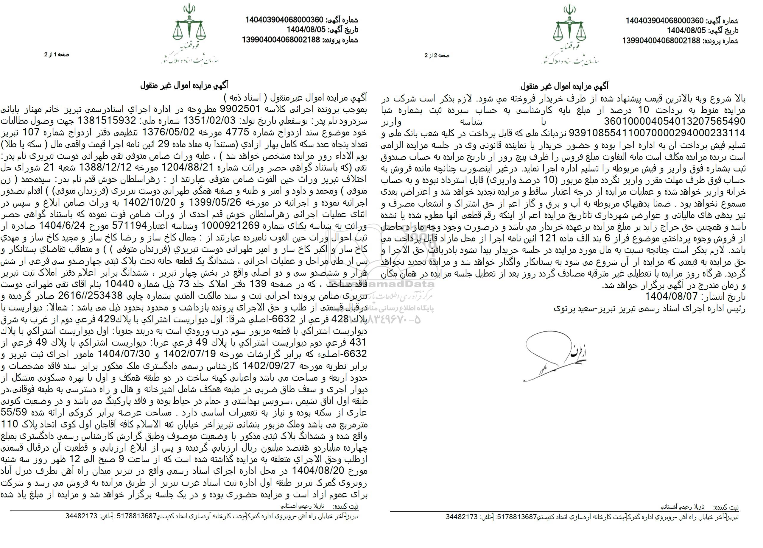 مزایده مشخص خواهد شد ) ، عليه ورات ضامن متوفی نقی طهرانی دوست تبریزی نام پدر نقی که باستناد گواهی حصر وراثت شماره 1204.88.21 مورخه 1388.12.12 شعبه 21 شورای حل اختلاف تبریز ورات حين الفوت ضامن متوفی عبارتند از: زهر اسلطان خوش قدم نام پدر: سید محمد ( زن متوفى ) ومحمد و داود و امیر و طیبه و صفیه همگی طهرانی دوست تبریزی فرزندان متوفی) ) اقدام بصدور اجرائیه نموده و اجرائیه در مورخه 1399.05.26 و 1402.10.20 به وراث ضامن ابلاغ و سپس در اثنای عملیات اجرانی زهر اسلطان خوش قدم احدی از ورات ضامن فوت نموده که باستناد گواهی حصر وراثت به شناسه یکتای شماره 1000921269 و شناسه اعتبار 571194 مورخ 1404.6.24 صادره از ثبت احوال ورات حين الفوت نامبرده عبارتند از: جمال کاخ ساز و رضا کاخ ساز و مجید کاخ ساز و مهدی کاخ ساز و اکبر کاخ ساز و امیر طهرانی دوست تبریزی فرزندان متوفی ( ) و متعاقب تقاضای بستانکار و پس از طی مراحل و عملیات اجرائی، ششدانگ یک قطعه خانه تحت پلاک ثبتی چهار صد و سی فرعی از شش هزار و ششصد و سی و دو اصلی واقع در بخش چهار تبریز، ششدانگ برابر اعلام دفتر