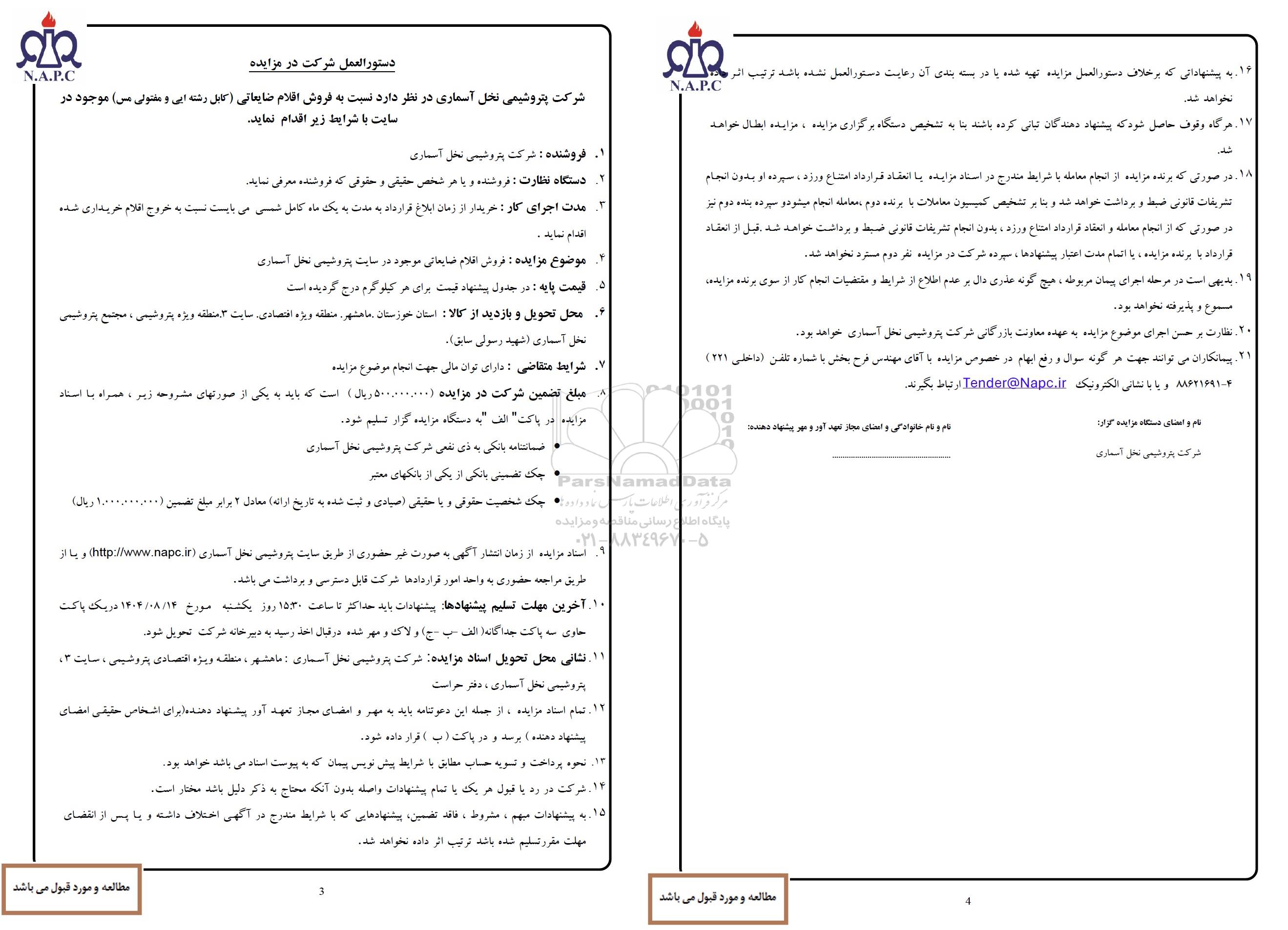 9- اسناد مزایده از زمان انتشار آگهی به صورت غیر حضوری از طریق سایت پتروشیمی نخل آسماری (http://www.napc.ir) و یا از طریق مراجعه حضوری به واحد امور قراردادها شرکت قابل دسترسی و برداشت می باشد.