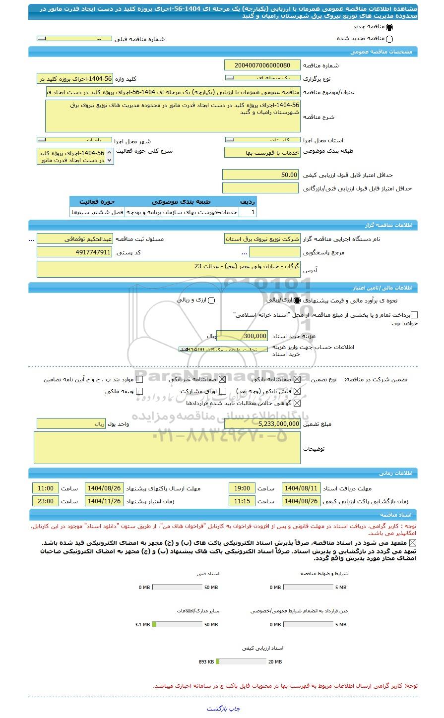 | شرح مناقصه | 1404-56-اجرای پروژه کلید در دست ایجاد قدرت مانور در محدوده مدیریت های توزیع نیروی برق شهرستان رامیان و گنبد | ||||||||