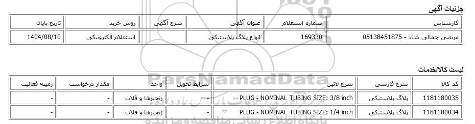 | مرتضی جمالی شاد - 05138451875 | 169330 | انواع پلاگ پلاستیکی | استعلام الکترونیکی | 1404/08/10 |