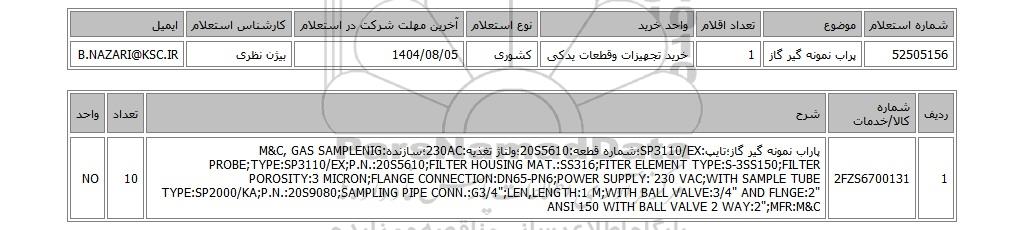 52505156پراب نمونه گیر گاز1خرید تجهیزات وقطعات یدکیکشوری1404/08/05بیژن نظریB.NAZARI@KSC.IR