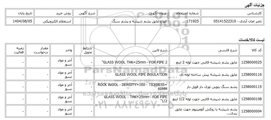 ناصر امان آبادی - 05141522310171925انواع عایق پشم شیشه و پشم سنگاستعلام الکترونیکی1404/08/05