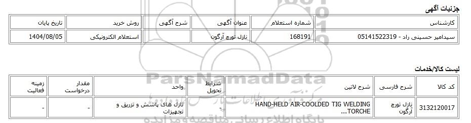سیدامیر حسینی راد - 05141522319168191نازل تورچ آرگوناستعلام الکترونیکی1404/08/05