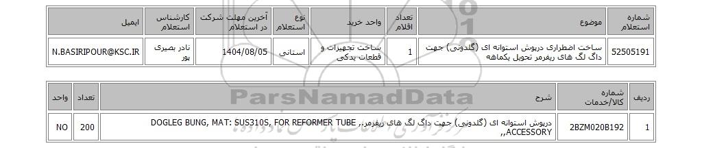 52505191ساخت اضطراری درپوش استوانه ای (گلدونی) جهت داگ لگ های ریفرمر تحویل یکماهه1ساخت تجهیزات و قطعات یدکیاستانی1404/08/05نادر بصیری پورN.BASIRIPOUR@KSC.IR