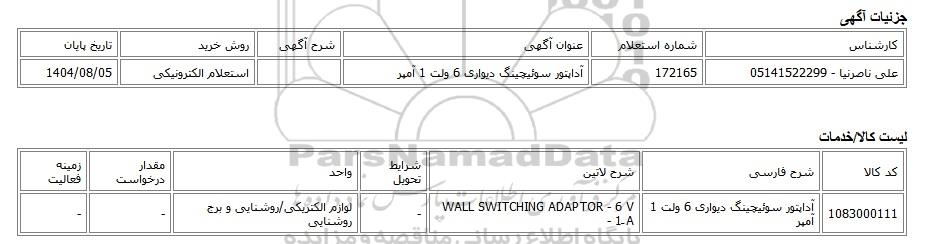 استعلام الکترونیکی آداپتور سوئیچینگ دیواری 6 ولت 1 آمپر, استعلام الکترونیکی، آداپتور سوئیچینگ دیواری 6 ولت 1 آمپر