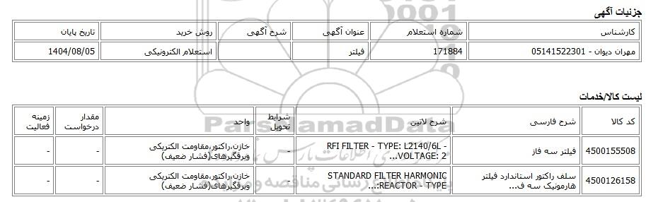 | مهران دیوان - 05141522301 | 171884 | فیلتر | استعلام الکترونیکی | 1404/08/05 |
